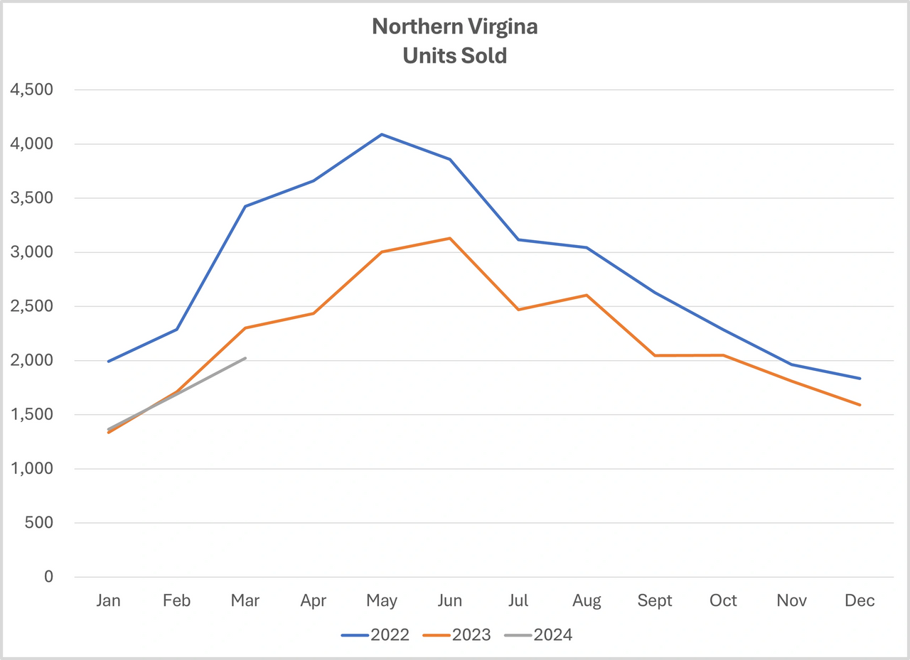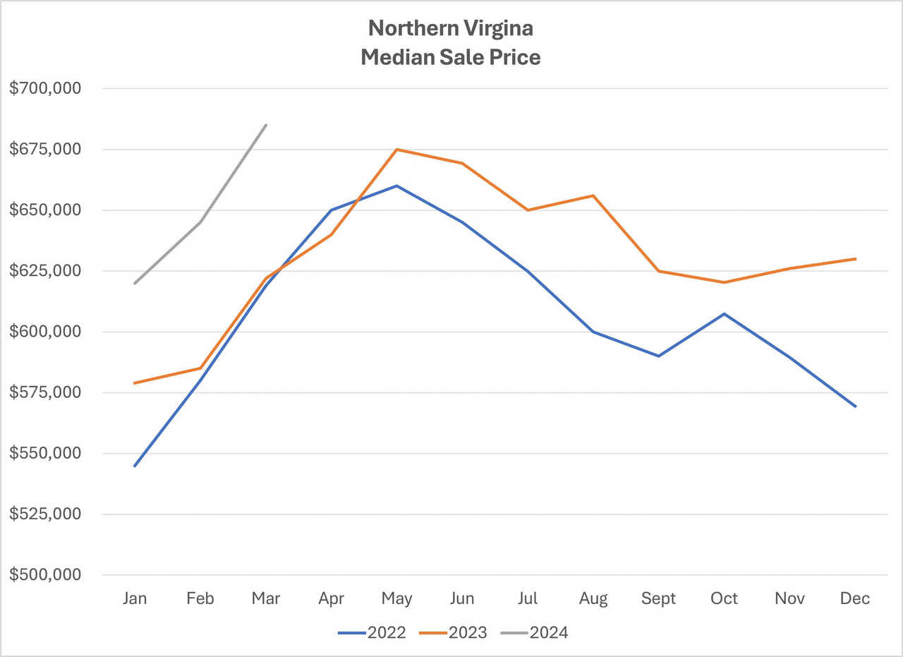As you will see below, I have put together two charts to share with you this month. Both represent all residentials sales within Northern Virginia (Arlington, Alexandria, Fairfax, Loudoun, and Prince William Counties and their jurisdictions) since January 2022. I find this information useful to get a sense for trends, although it is not a substitute for hyper-local data.